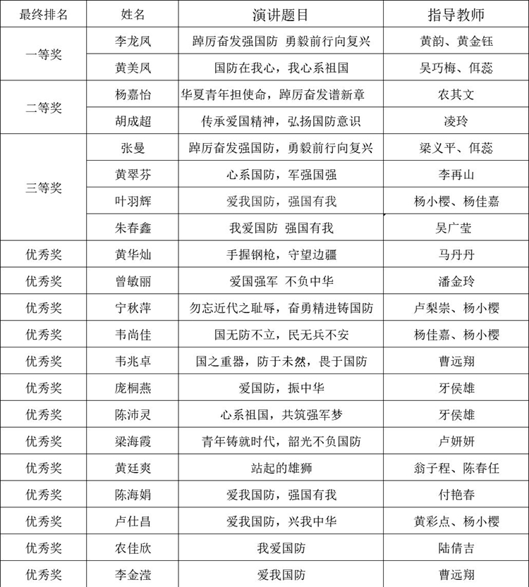 附:我院2023年“爱我国防”演讲比赛获奖名单