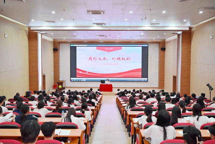 图为党委副书记、校长罗艳妮作题为《履行义务,行使权利》的专题培训