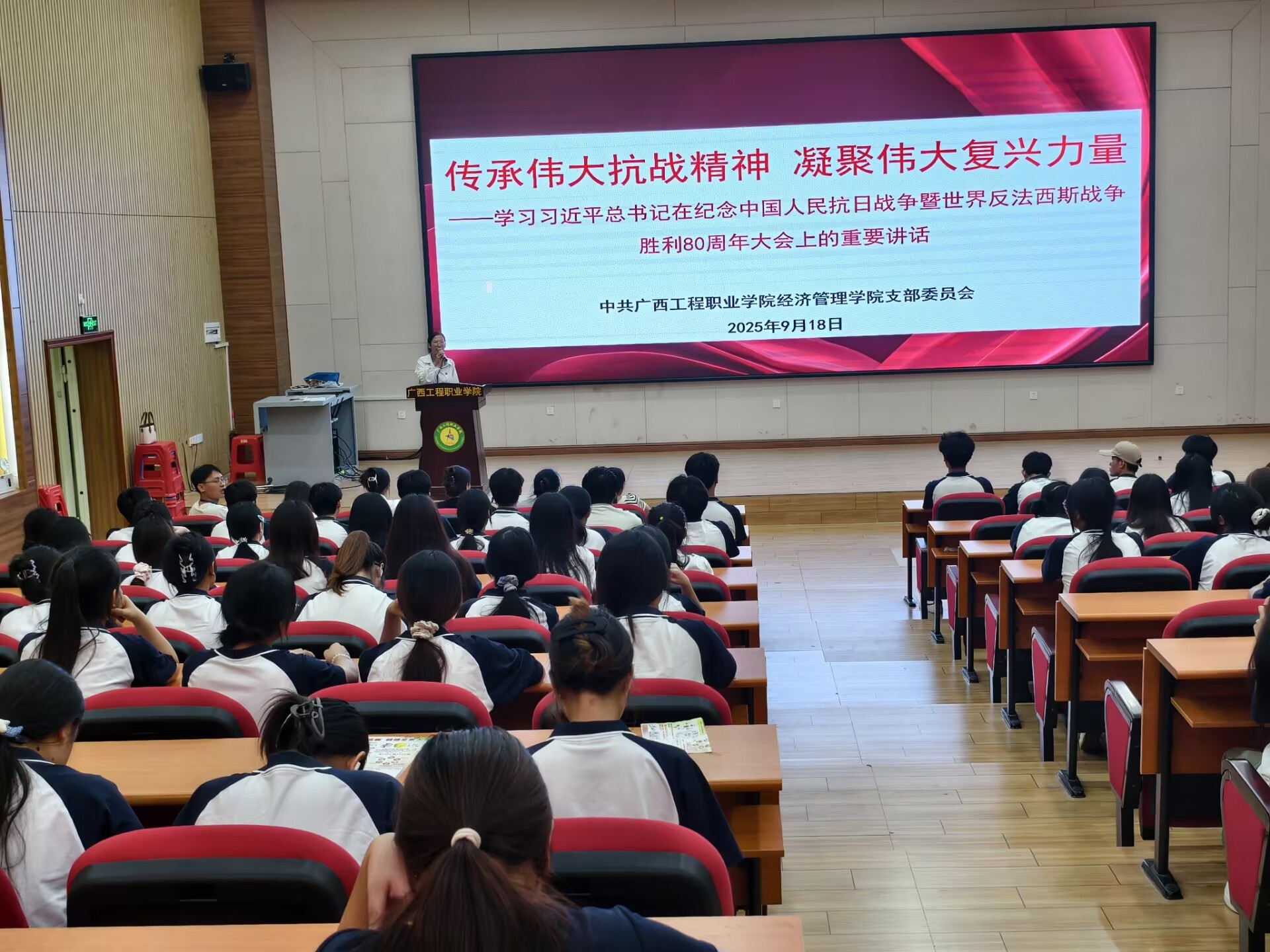 在这个特别的日子,结合9月3日的祖国大阅兵活动。经济管理学院党支部书记覃清香开展“传承伟大抗战精神 凝聚伟大复兴力量”的微党课活动,主要学习习近平总书记在纪念中国人民抗日战争暨世界反法西斯战争胜利80周年大会上的重要讲话。她通过围绕铭记历史,以史为鉴,从抗战记忆中汲前行智慧,在艰苦卓绝的抗战进程中,感悟和弘扬伟大抗战精神,激发师生们的爱国主义情怀,强化青年肩负民族复兴重任的责任感与使命感,为实现社会主义现代化与中华民族的伟大复兴贡献自己的青春力量。