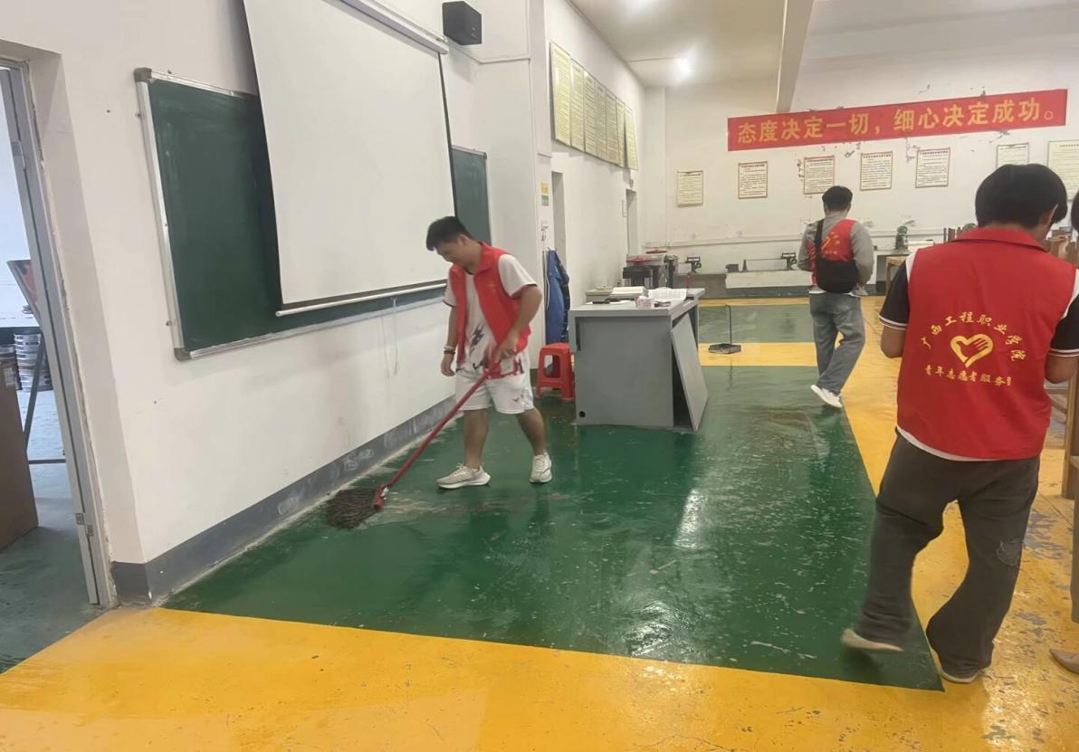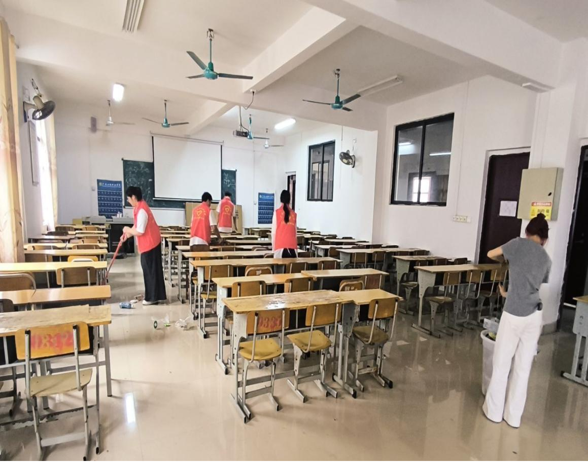 清洁教室卫生现场,志愿者认真清理卫生死角(窗台灰尘、墙角蛛网、垃圾桶倾倒及消毒)、检查办公设备的清洁与安全隐患等。