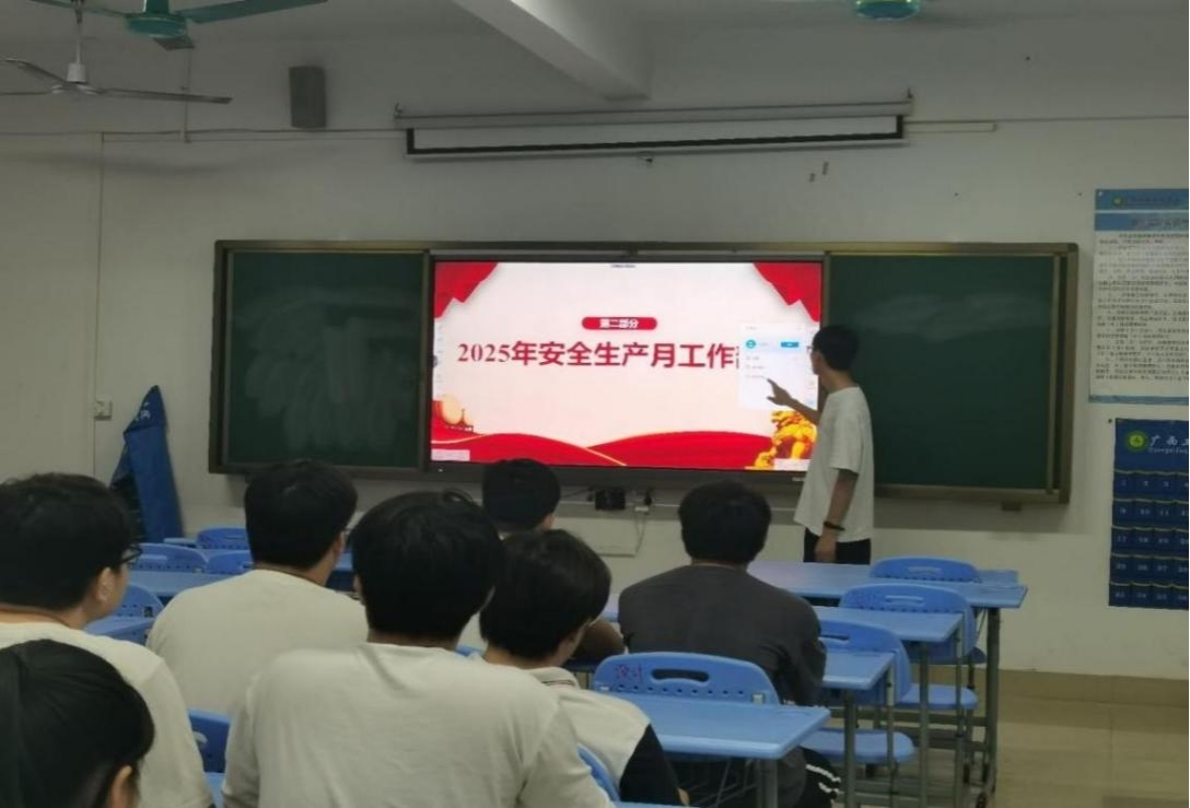 图为2024级辅导员梁宇主持2025年安全生产月主题班会