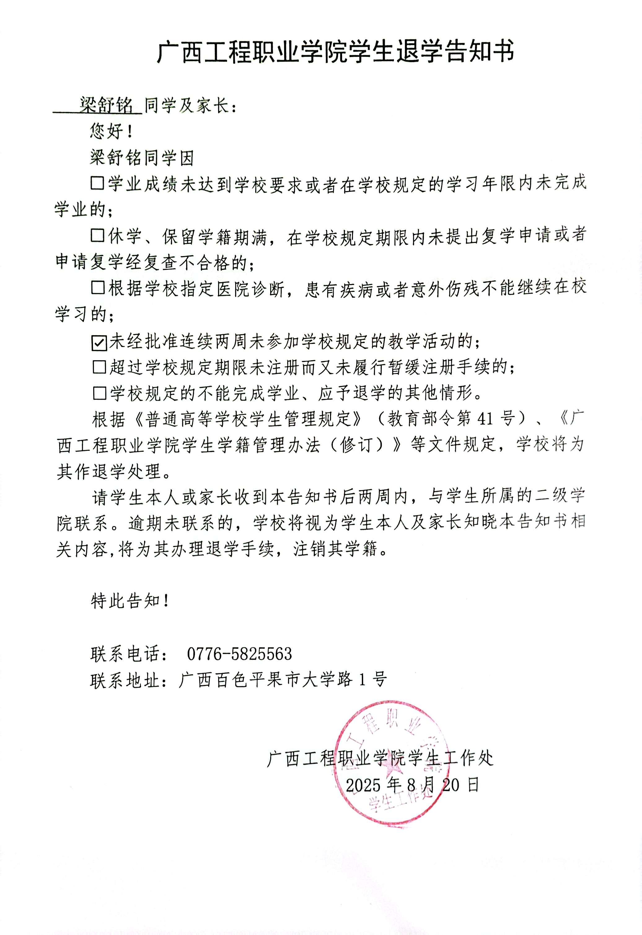 梁舒铭,男,学号:202266060018,艺术设计学院2023级建筑室内设计3班学生;该生于2025年8月4日返校,2025年8月7日离校,未经批准连续两周未参加学校规定的教学活动,对老师的提醒亦不回复,经多次联系学生本人及其家长均无果。学校于2025年8月21日邮寄退学告知书,因不是学生本人及其家人签收,处理告知书无法以直接送达、留置方式、邮寄方式送达本人。根据《普通高等学校学生管理规定》(教育部令第41号)、《太阳集团8722com学生学籍管理办法(修订)》规定,现通过太阳集团8722com艺术设计学院官网予以公告,公告时间为2025年9月11日至2025年10月11日,公告期满,即视为送达。