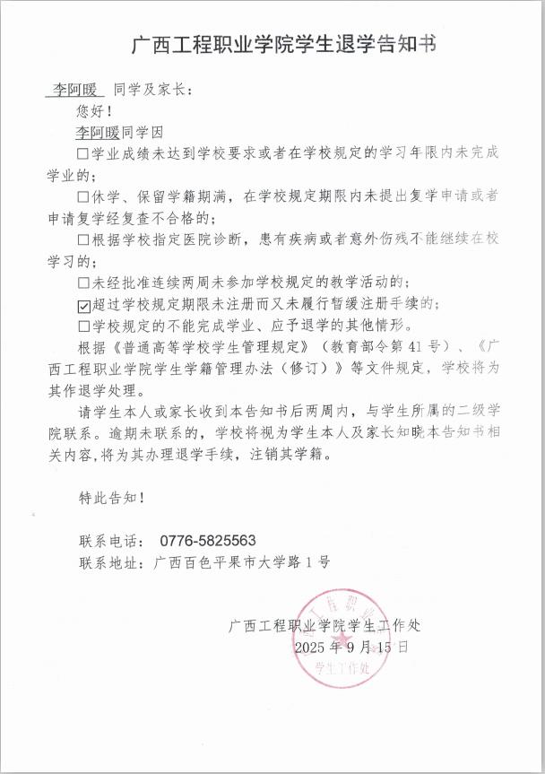 李阿暖,女,学号:202466020054,艺术设计学院2024级建筑室内设计2班学生;于2025年8月31日开学至今未返校,超过学校规定期限未注册而又未履行暂缓注册手续,对老师的提醒亦不回复,经多次联系其本人及其家人均无果。学校于2025年9月16日邮寄退学告知书,因不是学生本人及其家人签收,处理告知书无法以直接送达、留置方式、邮寄方式送达本人。根据《普通高等学校学生管理规定》(教育部令第41号)、《太阳集团8722com学生学籍管理办法(修订)》规定,现通过太阳集团8722com艺术设计学院官网予以公告,公告时间为2025年9月26日至2025年10月25日,公告期满,即视为送达。