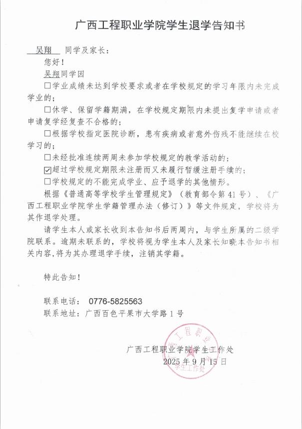 吴翔,男,学号:202466020004,艺术设计学院2024级建筑室内设计2班学生;于2025年8月31日开学至今未返校,超过学校规定期限未注册而又未履行暂缓注册手续,对老师的提醒亦不回复,经多次联系其本人及其家人均无果。学校于2025年9月16日邮寄退学告知书,因不是学生本人及其家人签收,处理告知书无法以直接送达、留置方式、邮寄方式送达本人。根据《普通高等学校学生管理规定》(教育部令第41号)、《太阳集团8722com学生学籍管理办法(修订)》规定,现通过太阳集团8722com艺术设计学院官网予以公告,公告时间为2025年9月26日至2025年10月25日,公告期满,即视为送达。