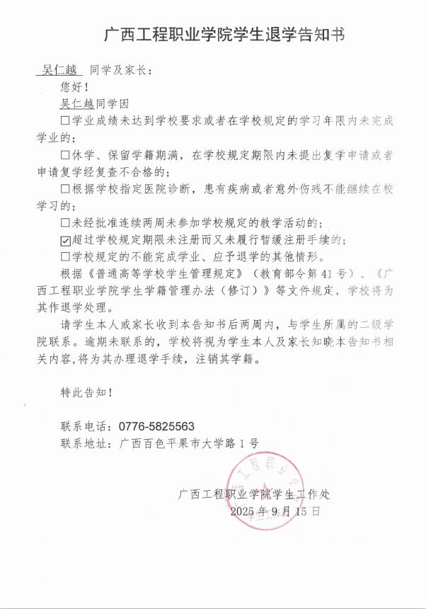 吴仁越,男,学号:202447020041,艺术设计学院2024级广告艺术设计2班学生;于2025年8月31日开学至今未返校,超过学校规定期限未注册而又未履行暂缓注册手续,对老师的提醒亦不回复,经多次联系其本人及其家人均无果。学校于2025年9月16日邮寄退学告知书,因不是学生本人及其家人签收,处理告知书无法以直接送达、留置方式、邮寄方式送达本人。根据《普通高等学校学生管理规定》(教育部令第41号)、《太阳集团8722com学生学籍管理办法(修订)》规定,现通过太阳集团8722com艺术设计学院官网予以公告,公告时间为2025年9月26日至2025年10月25日,公告期满,即视为送达。