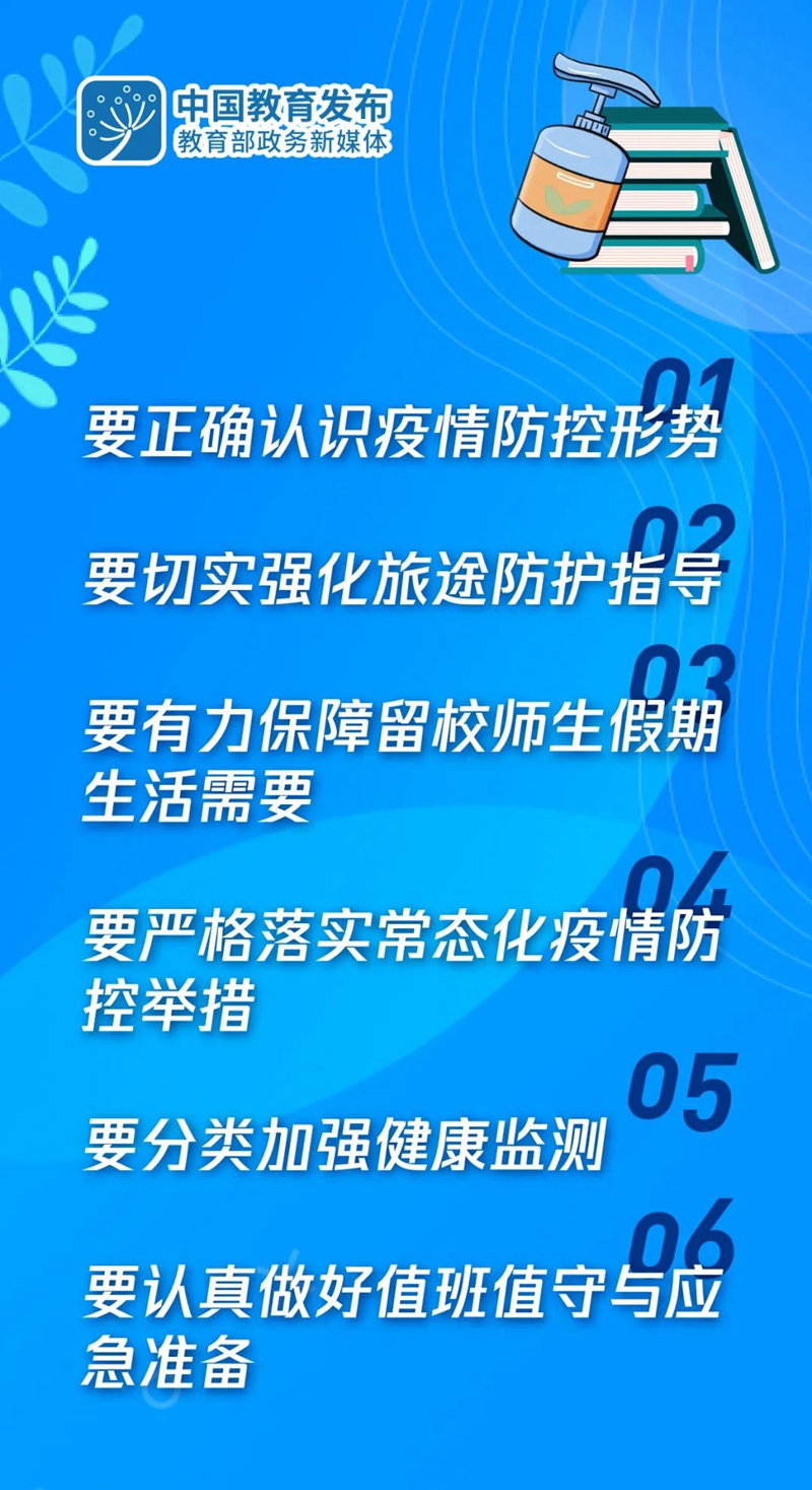 通知指出,要正确认识疫情防控形势。“五一”假期来临,各地教育部门和学校要高度重视“五一”假期疫情防控,坚持常态化精准防控和应急处置相结合,巩固拓展疫情防控成果,确保广大师生安全快乐度假。