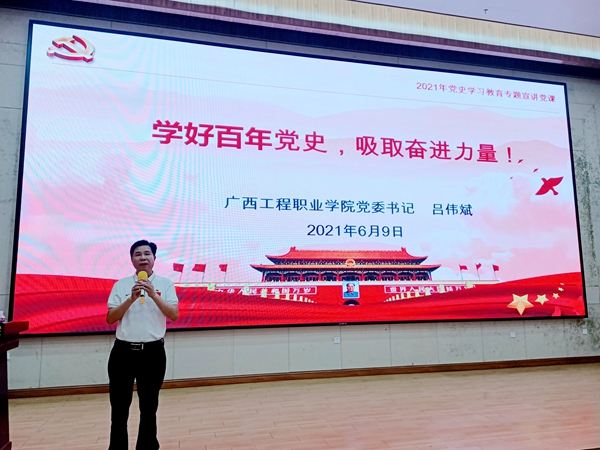 6月9日,在学校图文信息大楼一楼学术报告厅,学校党委书记吕伟斌为师生党员讲授主题为“学好百年党史,吸取奋进力量”的党史学习教育宣讲专题党课。学校各部门负责人,师生党员共300多人参加听课学习。