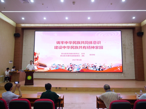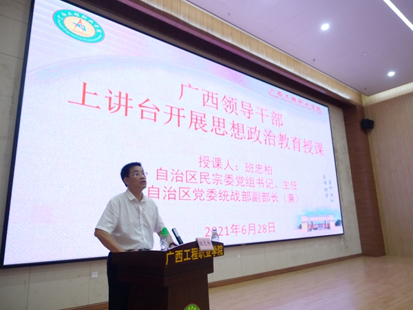 班书记重点围绕大力弘扬中华民族伟大精神,持续增进对伟大祖国,中华民族、中华文化、中国共产党、中国特色社会主义的认同;继承和发扬广西民族团结的优良传统,持续发挥好全国民族团结进步示范区的示范带动作用;坚决抵御宗教渗透,牢牢守住高校意识形态阵地等三个方面内容进行系统的授课。强调指出,当前我国正处于“两个一百年”奋斗目标的历史交汇期,奋进全面建设社会主义现代化国家新征程的新发展阶段,必须坚持习近平新时代中国特色社会主义思想为指导,扎实开展好党史学习教育,教育、引导人们牢固树立正确的历史观、民族观、国家观、文化观、宗教观,把历史当成最好的老师,从历史中吸取奋进的智慧和力量;要正确认识民族问题和宗教问题,大力加强民族团结,促进各民族像石榴籽一样紧紧拥抱在一起;要有正确的国家观念、宪法意识和公民意识,爱党爱国;要充分吮吸中华民族五千年来的优秀传统文化养分,弘扬革命文化和社会主义先进文化,筑牢社会主义核心价值观,自觉铸牢中华民族共同体意识。