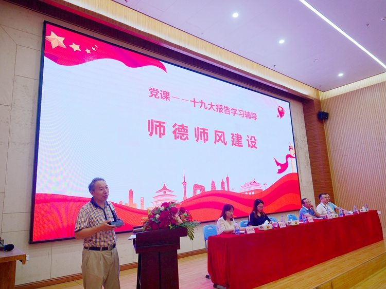 会上,胡细木副书记作“师德师风建设”主题微党课宣讲,他指出加强师风师德建设是提高教师队伍素质,全面贯彻党的教育方针,培养新时代高素质建设者和接班人的根本要求,全体教职工要把教书育人和师德修养结合起来,不忘立德树人的育人初心,坚持“四个统一”,争做“四有”好老师,当好学生健康成长的指导者和引路人。