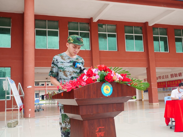 广西绿盾国防教育基地主任陆俊余教官代表、经济管理学院2021级新生代表朱开轩同学分别发言,共同表达了完成本次军训任务的坚定信心和决心。教师代表艺术设计学院胡楚楚老师发言,希望同学们通过军训,不断挑战自我、超越自我,锤炼意志,砥砺品质,以良好的军训状态,崭新的精神风貌展现大学生的时代风采。