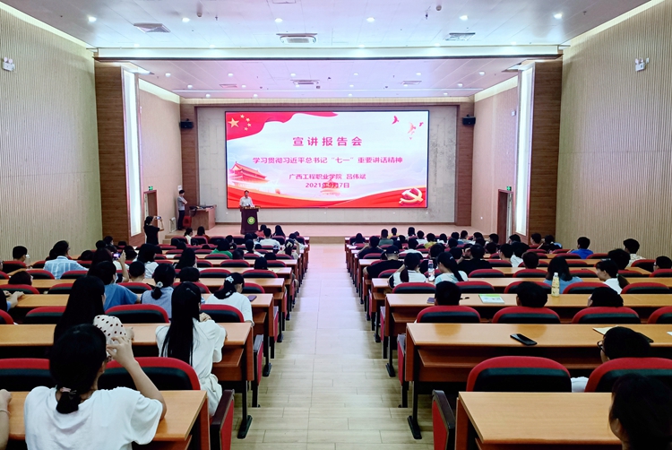 2021年9月7日下午,学校党委在图文信息大楼一楼学术报告厅举行学习贯彻习近平总书记“七一”重要讲话精神宣讲报告会,校党委委员、副校长、宣传部长彭高彬,校长助理黄秋霞,各党支部书记、各部门负责人、全校师生党员、教师代表、学生代表共300多人参加宣讲报告会。宣讲报告会由党委办公室副主任黄香琴主持,校党委书记吕伟斌研究员作宣讲报告。