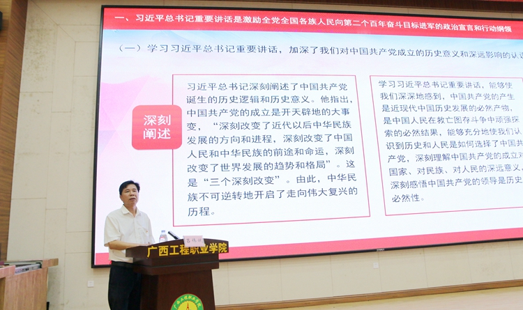 宣讲会上,吕伟斌对学校各级党组织和师生党员提出三点学习要求,一要把思想认识统一到习近平总书记“七一”重要讲话精神上,切实在学懂、弄通、做实上下功夫。二要把学习习近平总书记“七一”重要讲话精神作为全校开展党史学习教育的重要内容,进一步学史明理,从中国共产党百年波澜壮阔的奋斗历程中,进一步增强“四个意识”、坚定“四个自信”,做到“两个维护”,更加坚定、更加自觉践行初心使命,奋发有为的履职尽责、真抓实干,推动全校党史学习教育往深里走、往实里走、往心里走。三要把学习习近平总书记重要讲话同总结经验联系实际工作有机结合起来,推动学习成效不断转化为工作动力和工作实效。