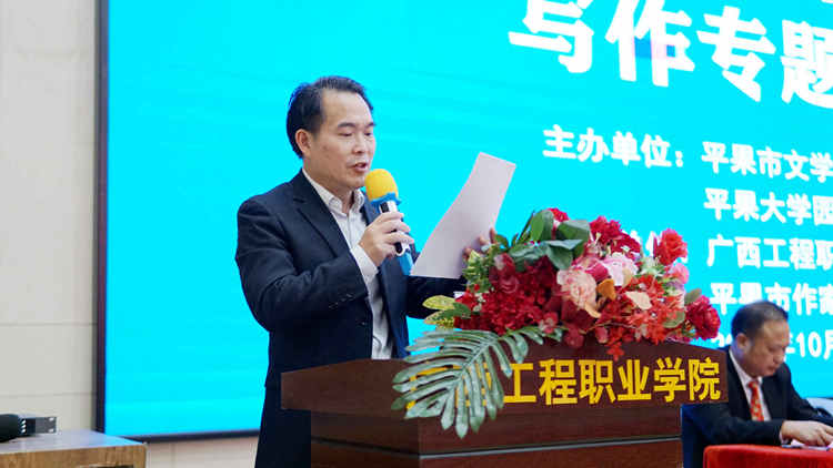 广西文联主席、广西作家协会主席、广西民族大学教授田代琳,百色市文联主席莫维铭,平果市委常委、宣传部部长陈丹,平果市文联主席张洲,平果市教育党工委专职副书记、教育局党组成员,平果大学园区党工委书记,管理服务中心党组书记许安著以及学校纪委书记李益、副校长林萌出席讲座。