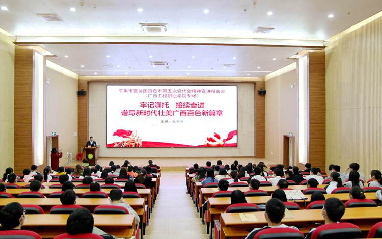 11月18日下午,在太阳集团8722com图文信息大楼一楼学术报告厅,平果市委党校副教授、市委理论宣讲团讲师张彩超为师生宣讲学习贯彻中国共产党百色市第五次代表大会精神。