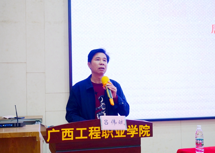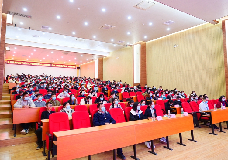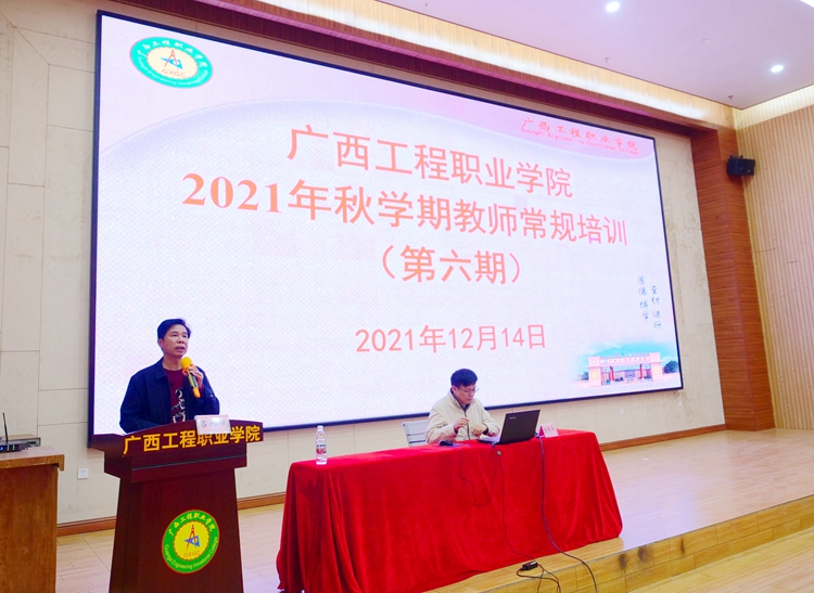 12月14日下午,广西教育厅原巡视员唐耀华教授在学校图文信息大楼一楼学术报告厅作主题为“全面贯彻习近平新时代中国特色社会主义思想,办好人民满意的教育”专题报告。学校党委书记吕伟斌,副校长吴先夏,校长助理、人事处处长蒋茂丽,校长助理覃清香等校级领导,各部门负责人、各党支部书记、行政人员、辅导员、专任教师等400多人参加报告会。报告会由吕伟斌主持。