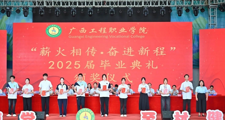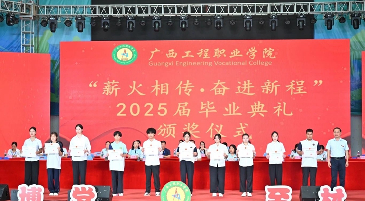 图为党委副书记、校长罗艳妮为2025届毕业生代表颁发毕业证书
