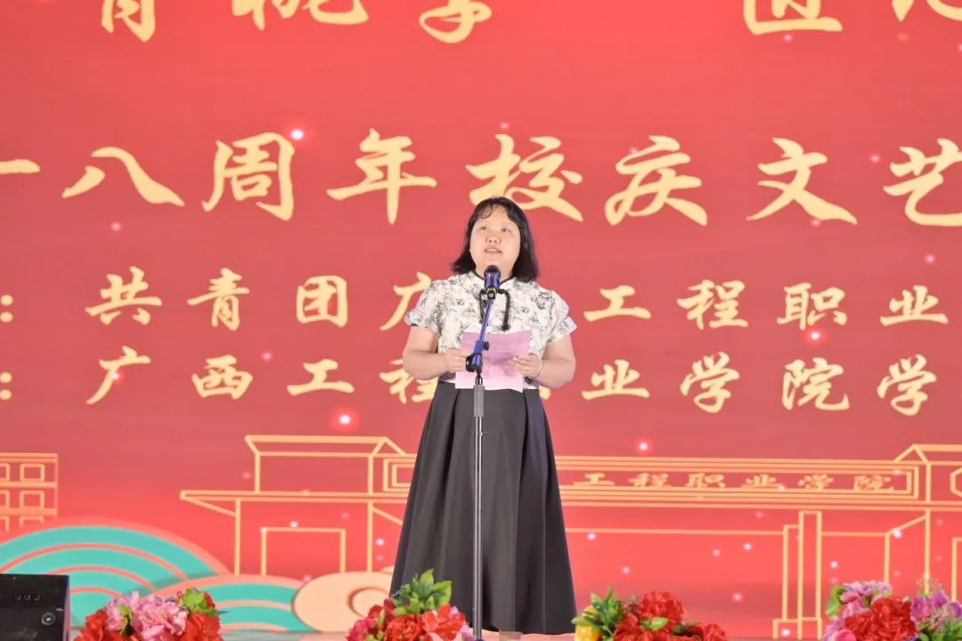党委副书记、校长罗艳妮致辞,她代表学校向莅临本次校庆晚会现场的各位领导、嘉宾表示热烈的欢迎!向全校师生员工和区内外广大校友致以节日的问候!向长期以来关心和支持学校发展的各位领导、社会各界表示最衷心的感谢和最崇高的敬意!