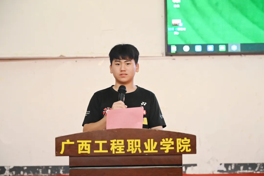 汽车与机电学院24级电子信息工程1班冷茂德同学发言。他表示很荣幸在学校羽毛球赛中获奖,他以三个关键词分享感受:感谢学校、裁判、教练与对手;坚持训练让他在逆风局也能沉着应对;对羽毛球的热爱则是前进的动力。这份荣誉已成过去,未来会继续保持热爱、刻苦训练,也期待更多同学加入羽毛球运动,一起在赛场上挥洒汗水、绽放青春!